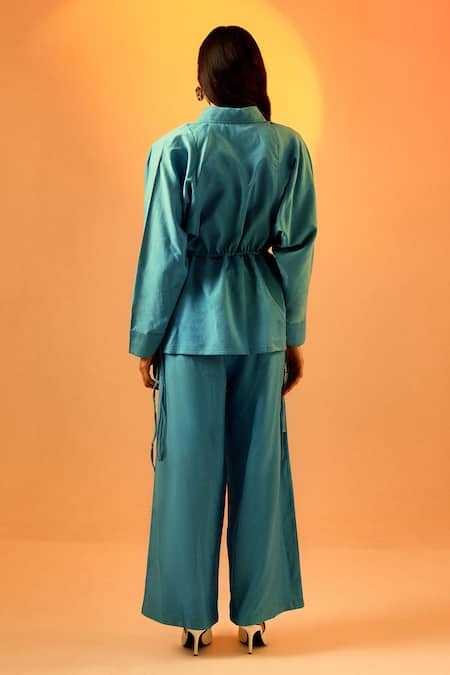 Blue Silk Embroidery Collared Blossom Shirt And Pant Set