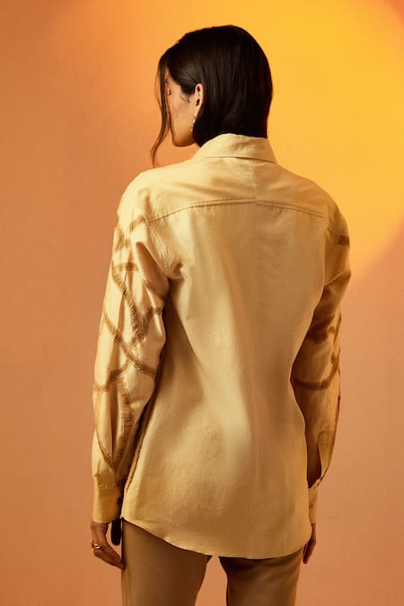 Beige silk shirt featuring full sleeves and a spread collar with contrast thread embroidery in an abstract pattern