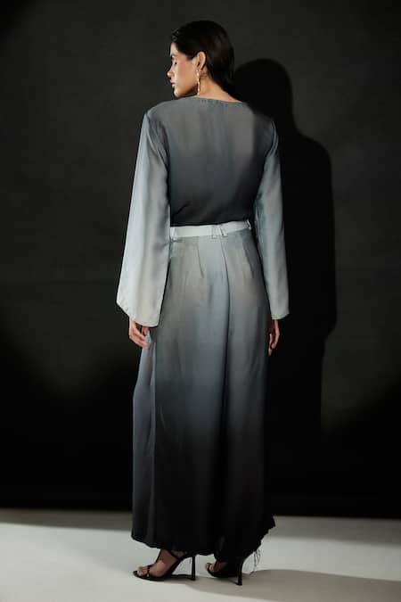 Black and grey ombre draped top featuring a cowl neckline and full sleeves. Paired with matching flared pants, creating a cohesive look.
