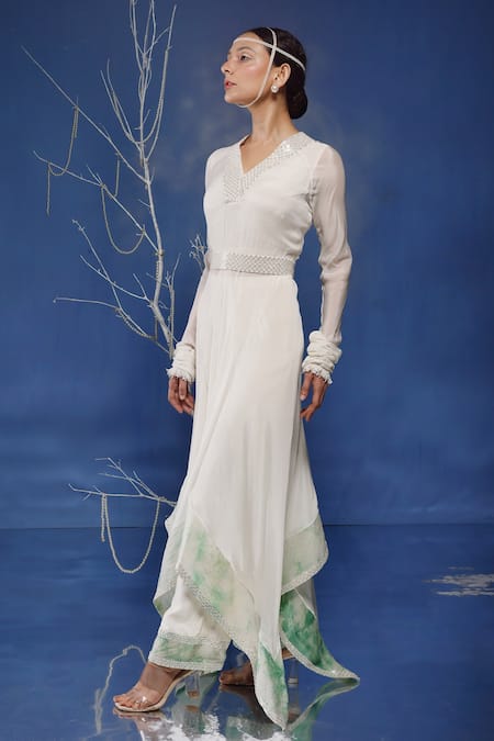 Off-white asymmetric kurta with a sequin embroidered neckline and tie dye hem. Paired with tie dye pant and embroidered belt.