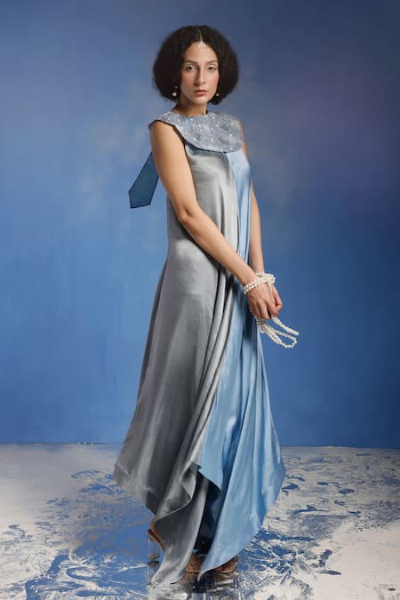 Blue colour block maxi gown with an asymmetric hem. Paired with an embroidered necklet.