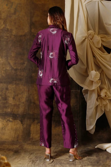 Buy_Eclat By Prerika Jalan_Wine Silk, Chanderi Pearls, Embroidery Collared Hand Jacket And Pant Set _Online_at_Aza_Fashions