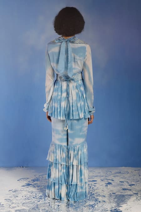 Buy_Eclat By Prerika Jalan_Blue Chanderi, Satin Organza, Silk Chiffon Bead Tie Dye Peplum Top Sharara Set _at_Aza_Fashions