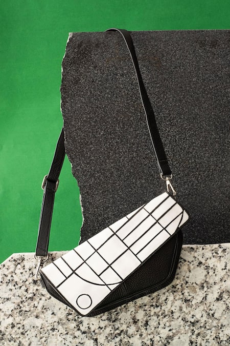 Black handcrafted leather fanny pack featuring a geometric design. It comes with a detachable strap for versatile carrying options.