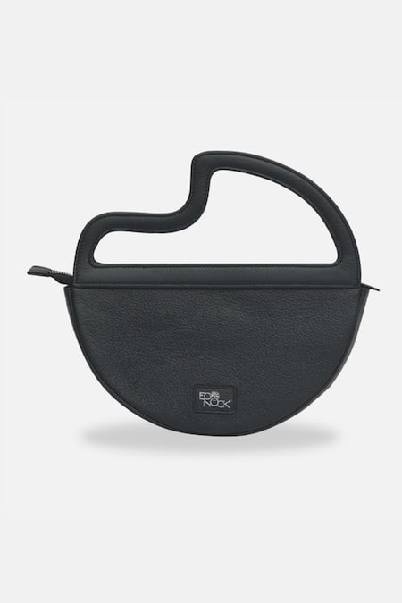 Black handcrafted crescent shaped clutch featuring a geometric design
