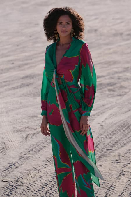 Green jumpsuit with fuchsia bonsai print & front tie-up detailing.