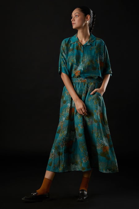 Buy_Yavi_Blue Viscose Linen Floral Print Eden Skirt_Online_at_Aza_Fashions