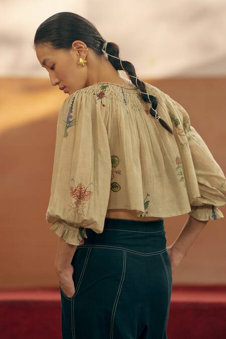 Buy_Cord_Ivory 100 % Cotton Botanical Round Edith Print Top_at_Aza_Fashions