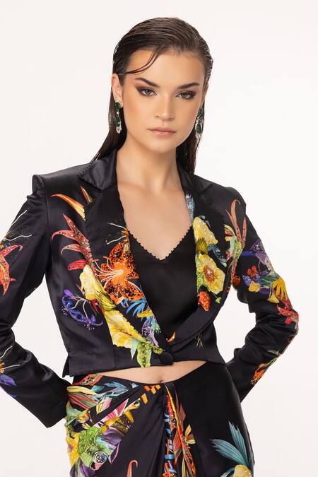 Black cropped blazer featuring botanical print with thread and sequin embroidery. Paired with a coordinating bustier and draped skirt.
