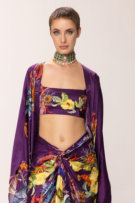 Purple bustier featuring a square neckline, paired with a botanical printed capelet and a knotted skirt. The ensemble showcases flared sleeves and intricate sequin and thread embroidery.