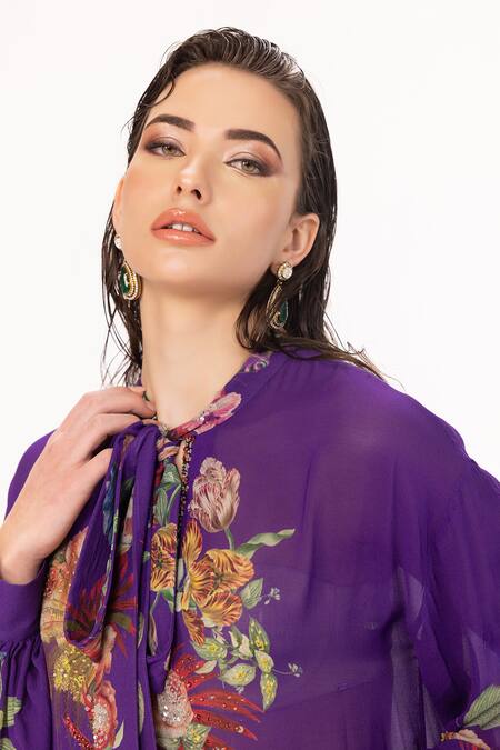 Purple tie-up top featuring botanical print with thread, sequin, and bead embroidery. Paired with matching purple pants adorned with floral elements.