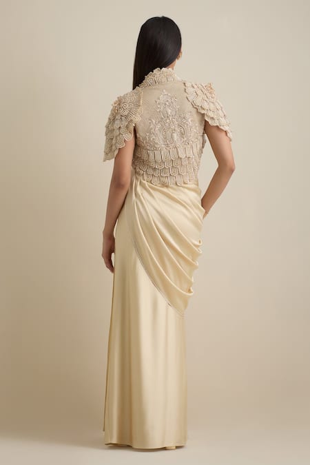 Ivory draped dress featuring a sweetheart neckline and a side zipper closure. Paired with a flower petal gradient cape style jacket adorned with pearls and pipes embellishments.