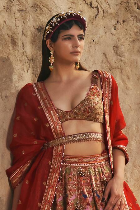 Red lehenga set featuring embroidered pichwai style flora and fauna motifs embellished with crystals. Comes with a padded bustier and embellished dupatta.
