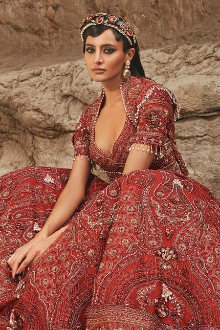 Maroon Silk Organza, Tulle Pearls, Elara Jamawar Embroidered Lehenga Set