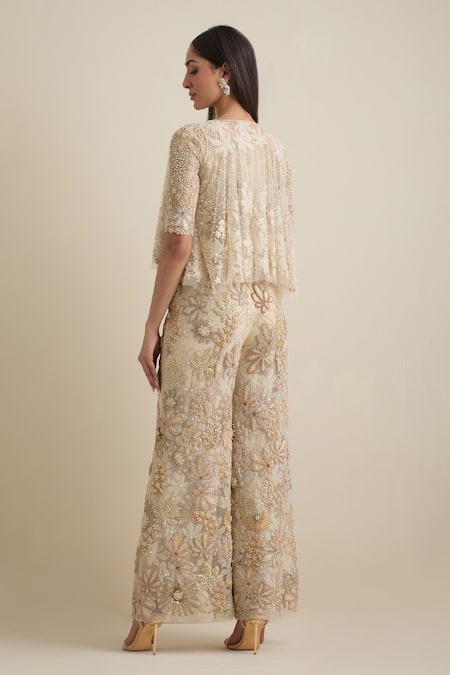 Ivory Organza, Net Embroidery, Cut Work, Sequins Floral Jumpsuit With Jacket