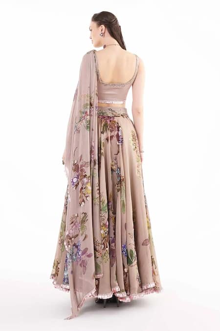 Beige lehenga featuring garden print and sequin placement embroidery. Paired with a sleeveless draped blouse with leaf neck design.