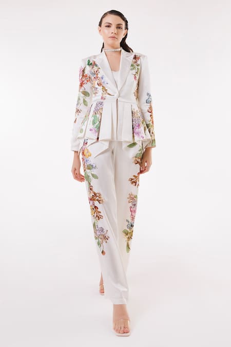 Ivory Satin, Ramie Sequins, Embroidery Floral Print Peplum Blazer Pant Set