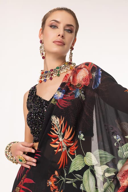 Black saree featuring vibrant floral print with sequin and thread embroidery. Paired with a sleeveless sequin embroidered blouse.
