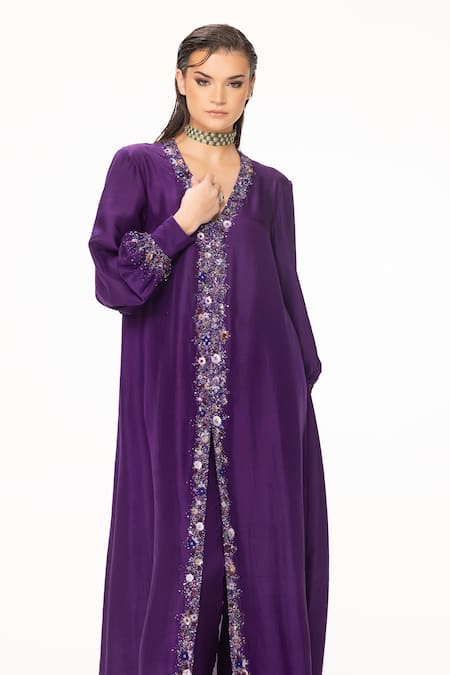 Purple dress featuring V neckline, puffed sleeves, and a front slit. Paired with coordinating pants, both adorned with intricate sequin, cutdana, bead, and thread embroidery in a floral pattern.
