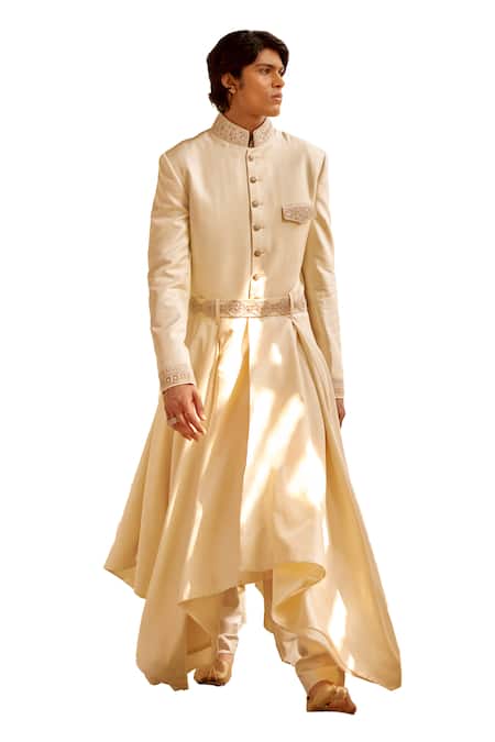 Ivory asymmetric flared sherwani featuring placed zari embroidered geometric motifs highlighted by pearls and sequin embellishments. It comes with an embellished belt for added elegance.
