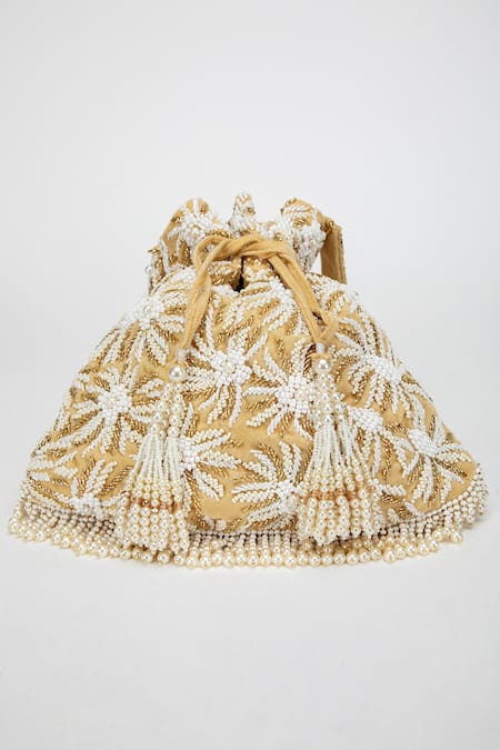 Gold velvet potli bag featuring an all-over floral pattern embellished with beads, cut dana, and pearls