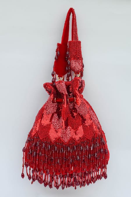 Red potli bag featuring embroidered sequins, crystals, and nalki work
