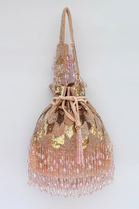 Pink Embroidery, Sequins, Crystals Fringe Potli Bag