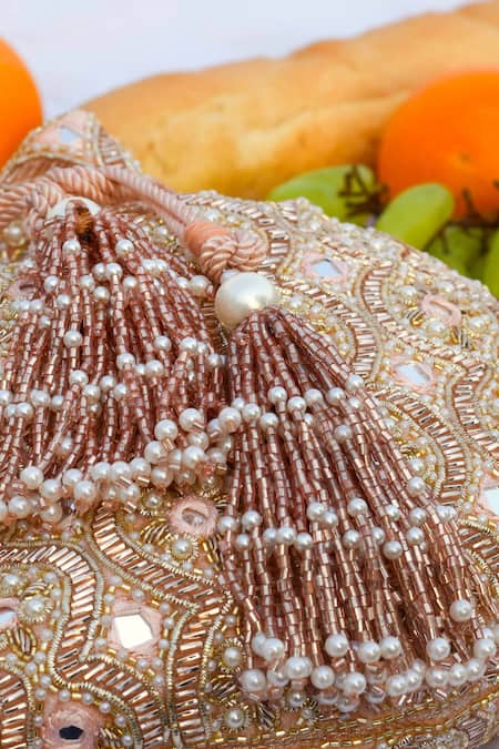 Pink potli bag crafted from velvet featuring hand embroidered mirror, pearl, zardozi, dabka work, and rhinestone embellishments