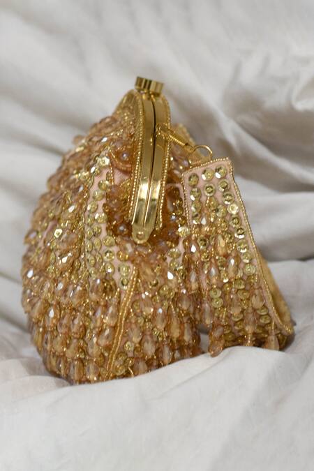 Gold clutch featuring intricate sequin hand-embroidery with crystal-beaded hangings