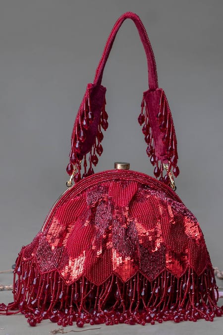 Red semi-circular clutch featuring all-over sequin and cutdana embellishment
