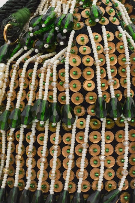 Emerald green potli bag featuring tiered hand-embroidered bead and crystal tassels
