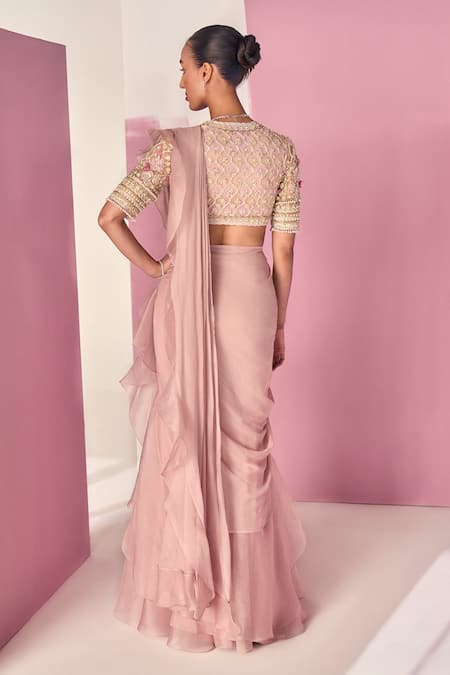 Dusky pink pre-draped saree featuring a ruffled silhouette. Paired with a floral jaal embroidered net blouse with elbow sleeves and plunge V-neckline.