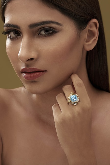 Desired by everyone, this gold hued ring flaunts a grand aquamarine crystal. The intricate design crafted around the square crystal adds poise.