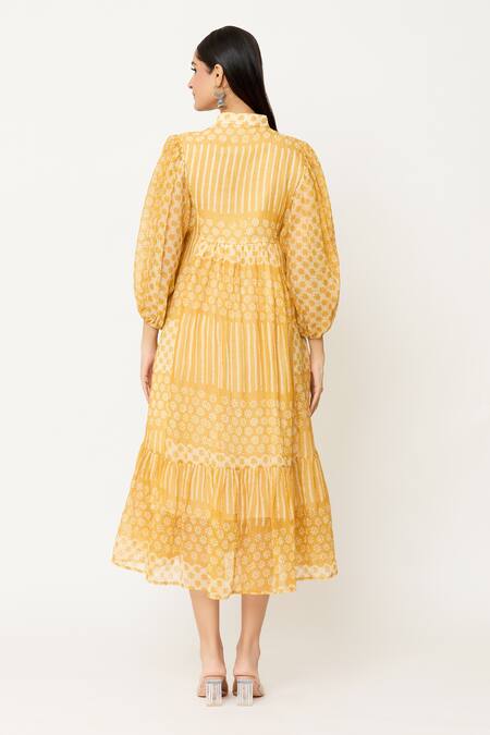 Buy_EK Katha_Yellow Kota Doria Collared Batik Block Print Balloon Sleeve Midi Dress_Online_at_Aza_Fashions