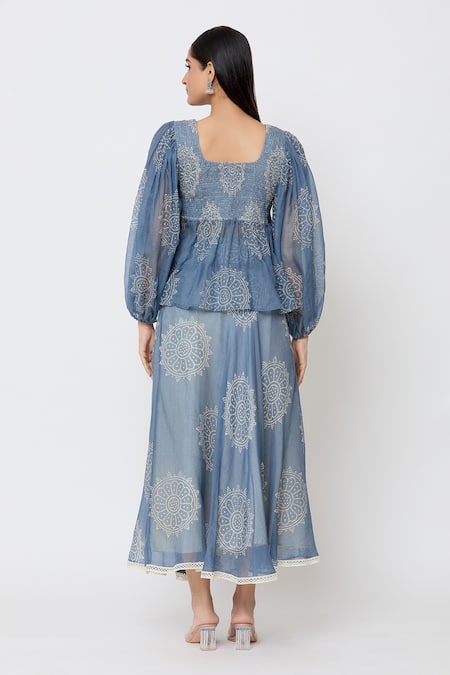 Blue long top featuring balloon sleeves and square neckline with floral batik print. Paired with a matching batik print skirt that has a pleated flare design.