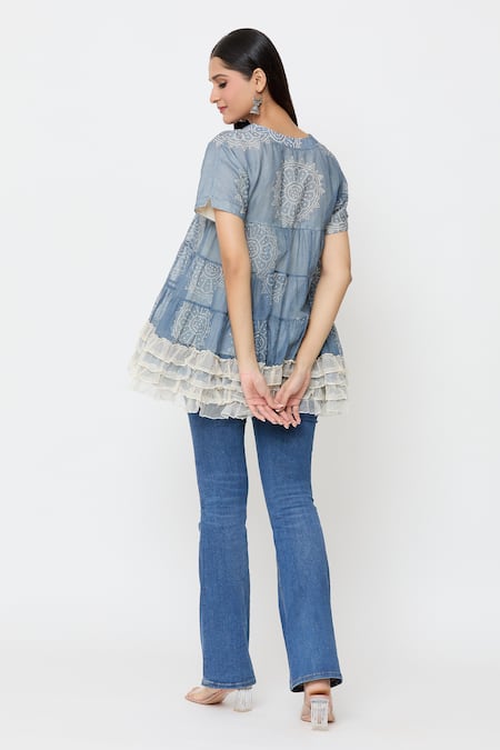 Blue long top featuring an all-over floral batik print and ruffled hem
