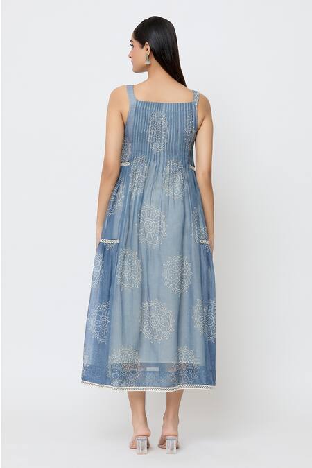 Blue Kota Doria Embroidery Square Neck Flower Butti Batik Print Dress