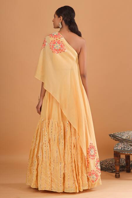 Yellow Chanderi Asymmetric Cape And Lehenga Set