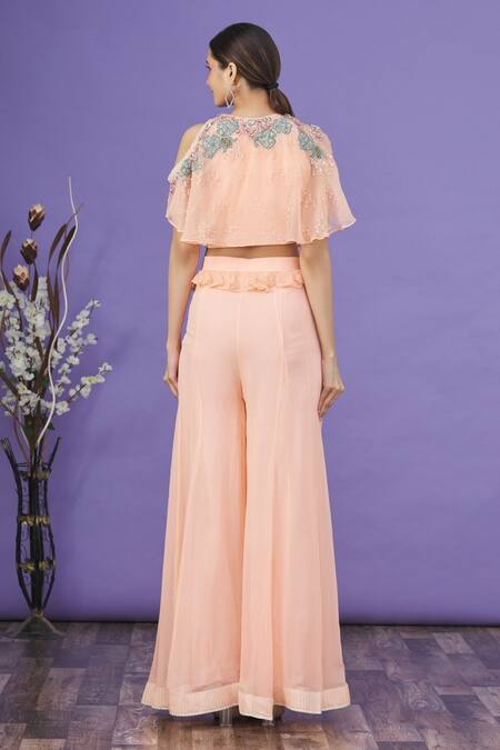 Peach floral embroidered cape style crop top. Paired with panelled sharara.