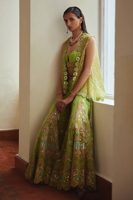 Green flared sharara with intricate hand embroidery in mirrorwork. Paired with a halter neck padded bustier and a sheer jacket highlighted with gold print, sequins and mirrorwork at the border.
