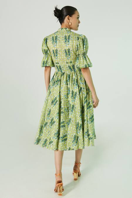 Green midi dress featuring floral and geometric prints with puffed sleeves