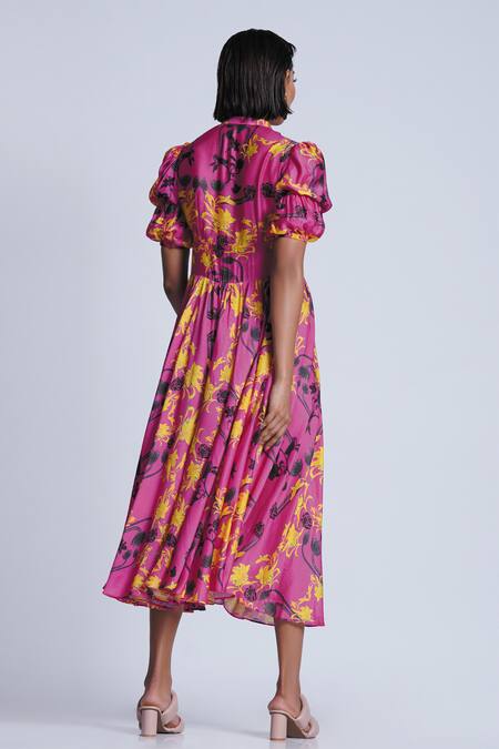 Pink midi dress featuring a V neck, short puff sleeves, and an all-over floral print