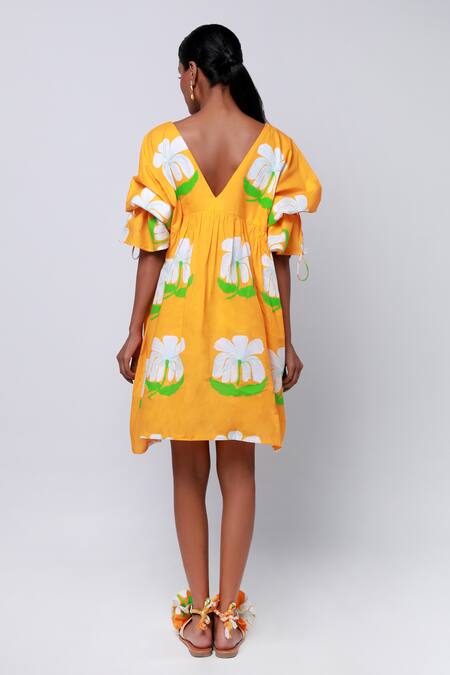 Orange dress featuring a V neckline, balloon sleeves, and a flower print