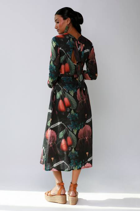Black Cotton Round Neck Iris Wheat Printed Dress
