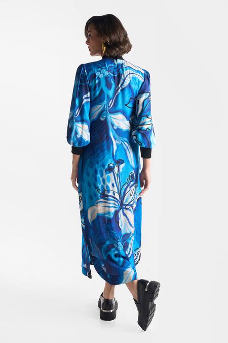 Buy_Ekastories_Blue Modal Collared Lapis Lazuli Rib Printed Dress_at_Aza_Fashions