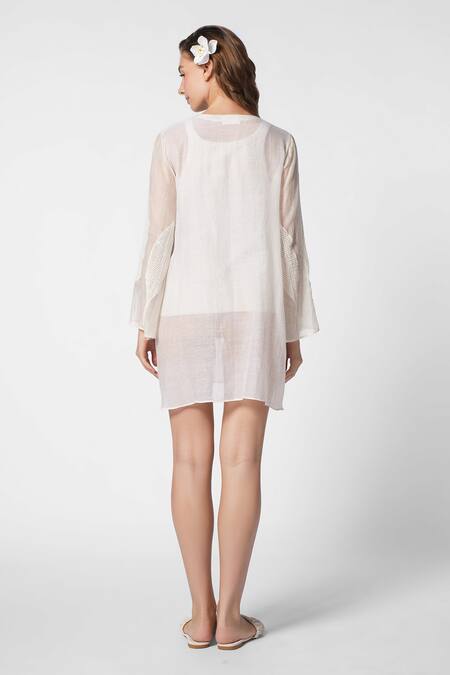 Off white dress featuring flared sleeves and leaf-shaped mesh embroidery. Comes with an inner layer for added comfort.