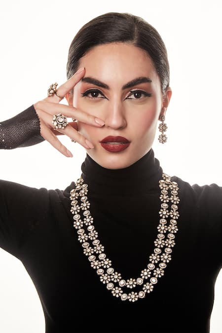 Gold Victorian double layered necklace featuring floral polki embellishments. Paired with matching danglers for a complete look.
