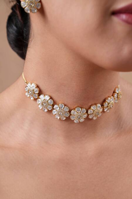 Gold Plated Imitation Diamonds Moissanite Polki Choker And Earring Set