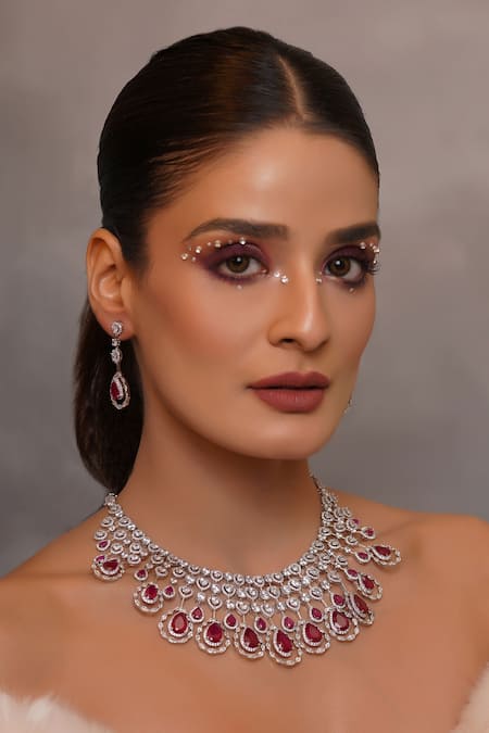 Tear drop shaped ruby stone embellishments, Adjustable dori closure for necklace, Push back clasp for earrings