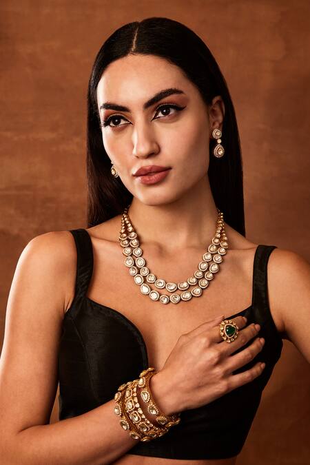 Double layered design with gleaming globule pattern, Moissanite polki embellishments, Adjustable dori closure
